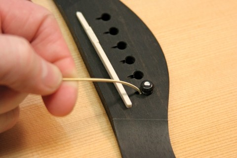 6번 줄의 볼 엔드를 브리지 홀에 넣고, 브리지 핀을 밀어 넣습니다.